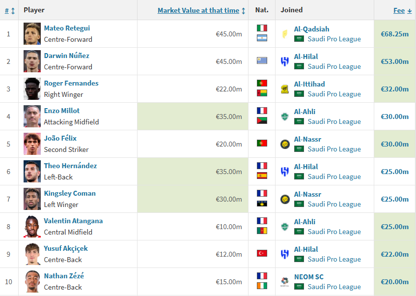 根据德转数据,沙特联今夏转会费排名前十位的新援几乎全部来自欧洲五大联赛,且其中无一人的年龄超过30岁。