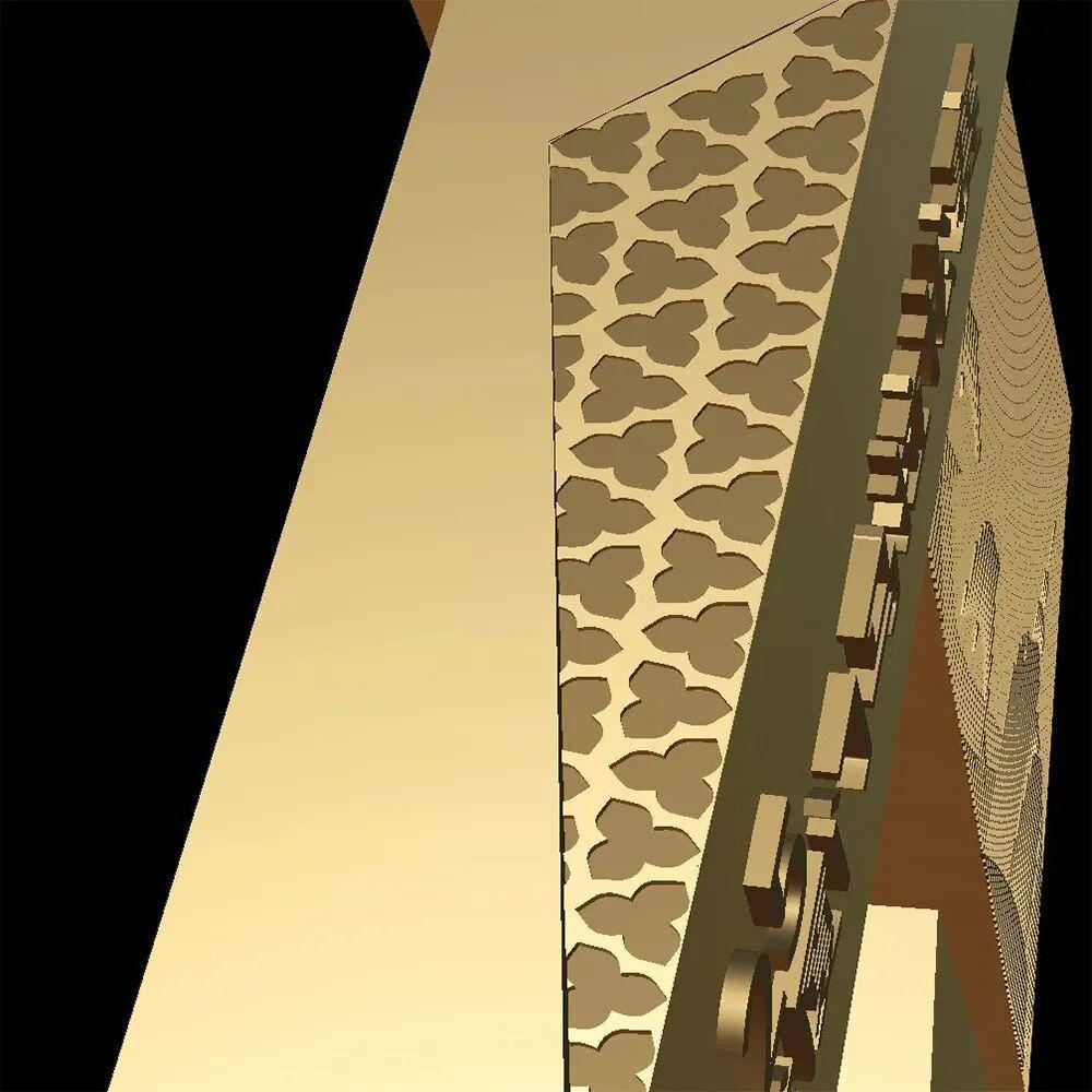 趟栊门边是两扇烤漆工艺的彩色“玻璃”,打开趟栊门,背后是广州城市地标建筑群。奖牌两侧,以两道麦穗(寓意“五羊衔穗”)为装饰。