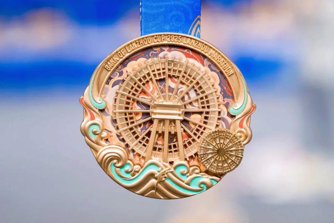兰马今年的奖牌正面是可以旋转的黄河水车装置(可手动旋转),敦煌元素的藻井纹样、飞天衣袂与黄河浪纹交相辉映。背面则以中山桥、黄河楼、奥体中心等蕴含历史文化与现代城市的元素,辅以镶嵌的彩陶纹路为主展示。