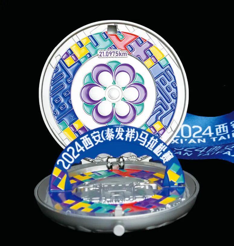 2024年的西马奖牌以“花”作为主元素。整块奖牌更像是一只可以打开的“怀表”。奖牌外壳是宝相花纹样以及石榴花。打开奖牌外壳,是可立面的起跑拱门,内壳下翻面则是历届西马的起点永宁门。