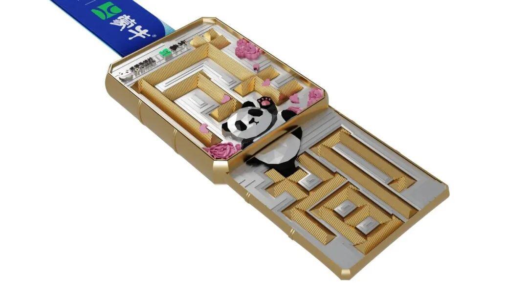 设计继续沿用了可爱的“熊猫”作为自己的城市名片。相较去年,今年在互动设计山,成马采用了双端伸缩式设计(可像拉抽屉一样拉开)。奖牌正面以极具代表性的“宽窄巷子”俯瞰图为造型灵感,拉开奖牌,即为'成都’二字。奖牌下方则是被芙蓉花环绕的熊猫。侧边的竹节设计寓意“节节攀升”。奖牌背面则以流沙设计,叠加熊猫、银杏叶、芙蓉花瓣、成都地标剪影……融合了历史文化与现代,颇具巧思。